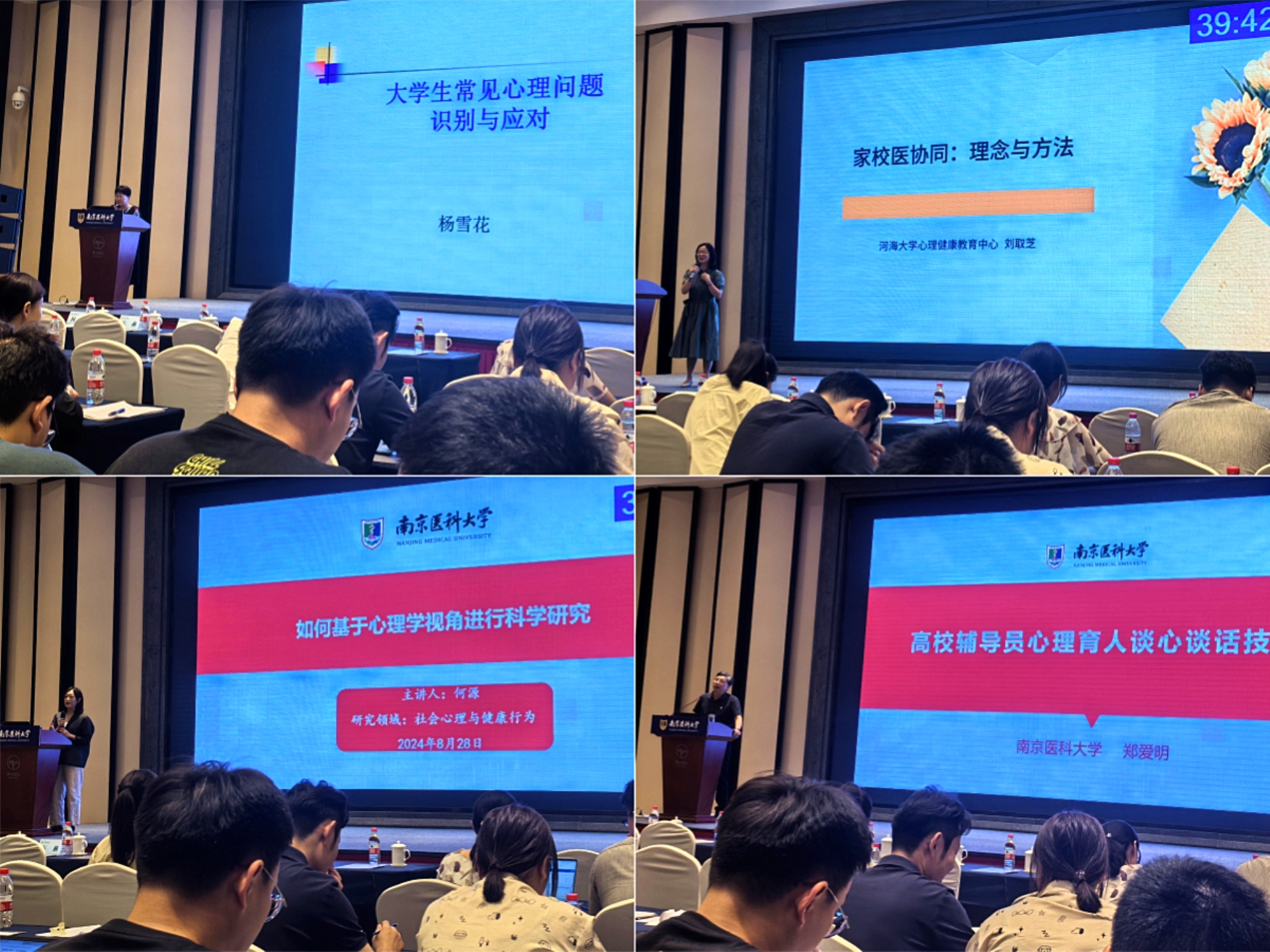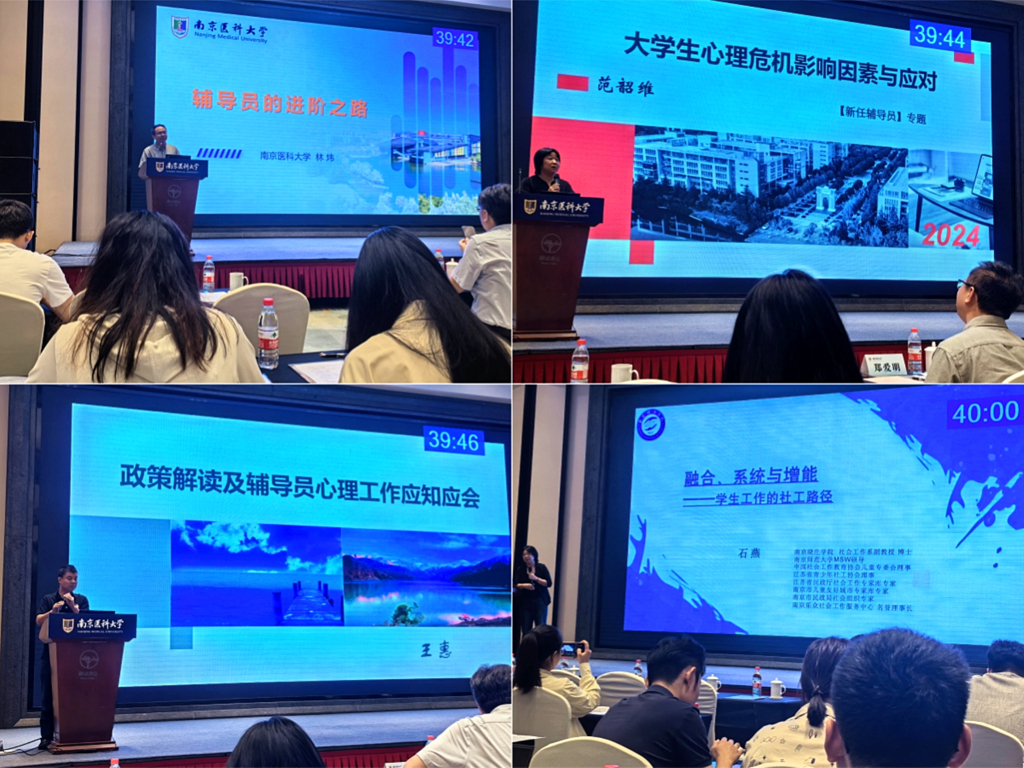 次日,南京航空航天大学心理健康教育中心主任杨雪花老师主讲的 “大学生常见心理问题识别与应对”,为辅导员在日常工作中及时发现和处理学生心理问题提供了实用方法;河海大学学生工作处副处长刘取芝老师带来的 “家校医协同:理念与方法”,凸显了家庭、学校和医院三方合作在学生心理健康教育中的重要性;南京医科大学马克思主义学院何源教授的 “如何基于心理学视角进行科学研究”,为辅导员开展心理研究开拓了新的思路与方法;南京晓庄学院旅游与社会管理学院石燕副教授主讲的 “系统、增能与治理:高校学生工作的社工路径”,拓宽了辅导员们的工作视野;最后,江苏省高校心理健康与研究中心(江宁基地)主任郑爱明老师分享了 “高校辅导员心理育人谈心谈话技巧”,为辅导员与学生进行有效沟通提供了宝贵经验。