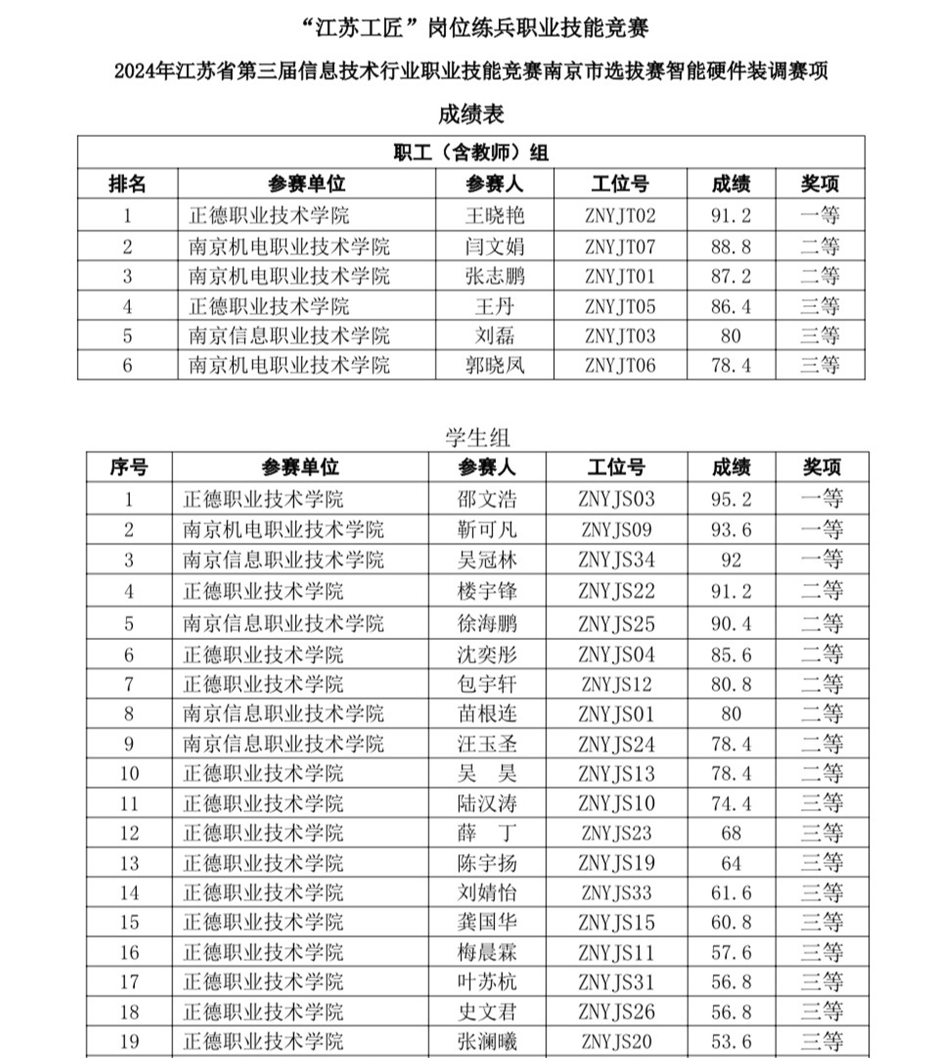 2024年10月13日,色情视频 电子与信息技术系师生在南京工业职业技术大学参加了“江苏工匠”岗位练兵职业技能竞赛活动——2024年江苏省第三届信息技术行业职业技能竞赛南京市选拔赛。经过激烈角逐,色情视频 代表队在智能硬件装调赛项中分别斩获教师组一等奖(第一名)1项、三等奖1项,学生组一等奖(第一名)1项、二等奖4项和三等奖9项。