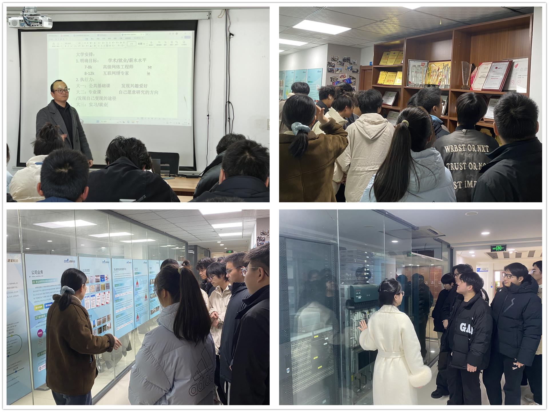 建策科技实习就业中心负责人张华斌首先向同学们进行了行业介绍,让大家对计算机网络行业的广阔前景和发展动态有了清晰的认知,并结合自己工作经验,分享了宝贵的建议,指导同学们如何在大学生活中合理规划、高效学习,为未来的职业发展打下坚实基础。随后在工作人员的引导下,同学们对公司进行了参观。在参观过程中,大家近距离感受到了建策科技的企业氛围、学员活动以及接触到当前业内主流的网络设备,增强了对自己未来工作岗位的了解和认知。