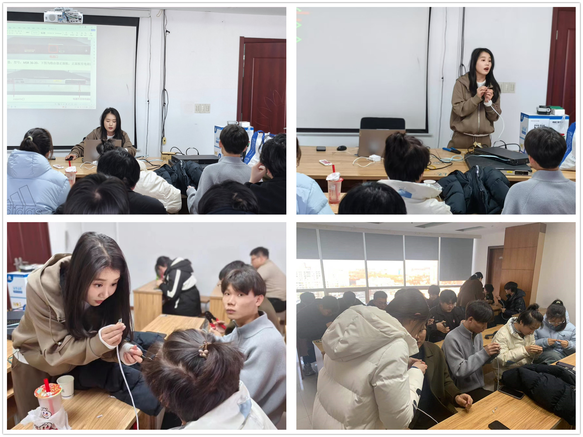 下午,建策科技网络工程师曹畅带领学生进入真机设备的认知环节。她详细地向大家介绍常见网络设备的功能、特点以及在实际工作中的应用场景,让同学们对这些平日里在书本上学习到的设备有了直观而深刻的认识。之后,曹畅带领大家进行网线制作实操环节。她耐心地向同学们讲解网线制作的方法和技巧,同学们全神贯注地聆听。讲解结束后,同学们纷纷领取相关材料,动手制作起来。建策科技也为前六位成功制作出合格网线的同学送上了精心准备的小礼物,这份礼物不仅是对同学们动手能力和学习成果的肯定,更寓意着在未来的学习和生活中希望同学们能时刻保持温暖与热情。
