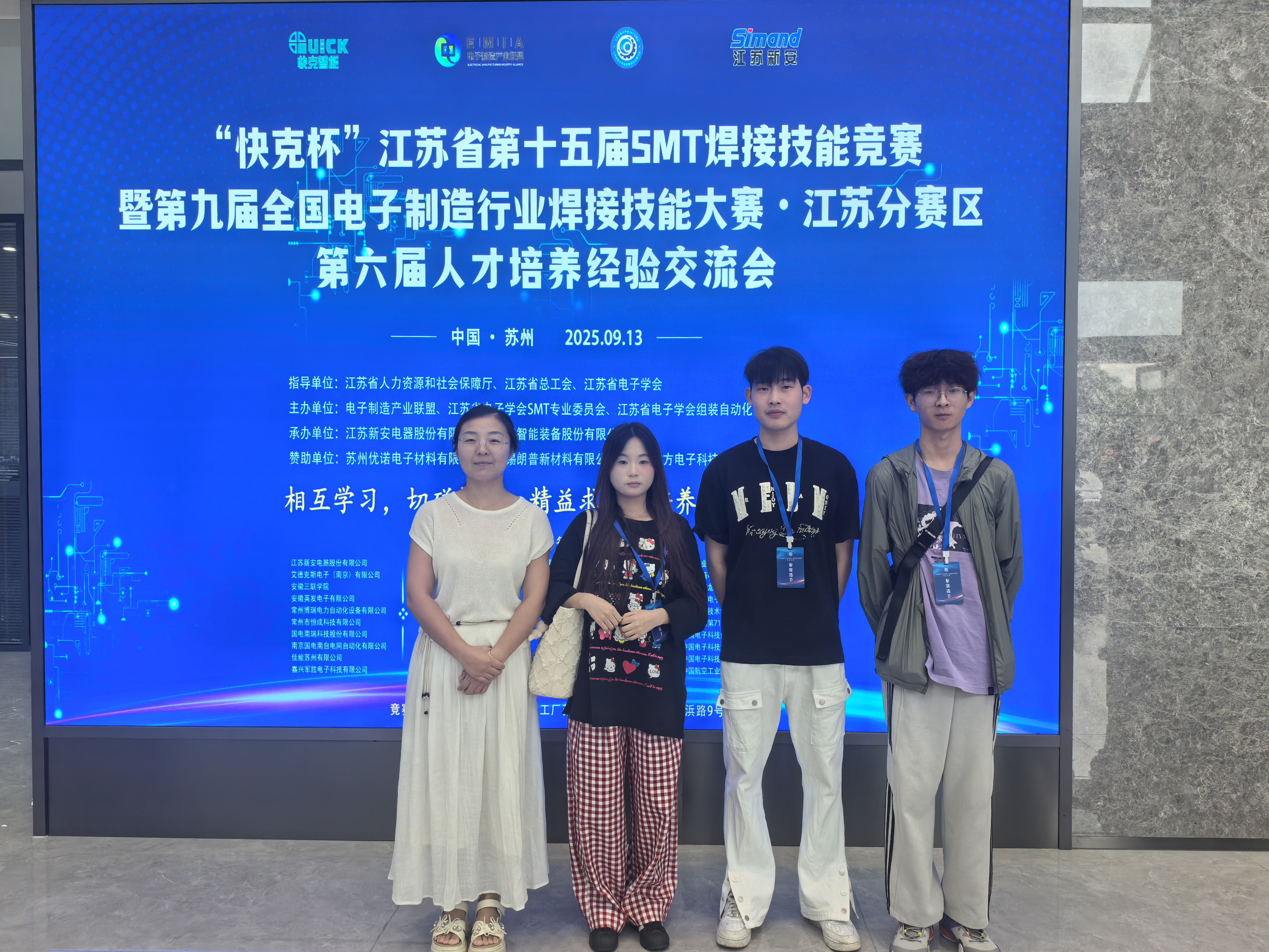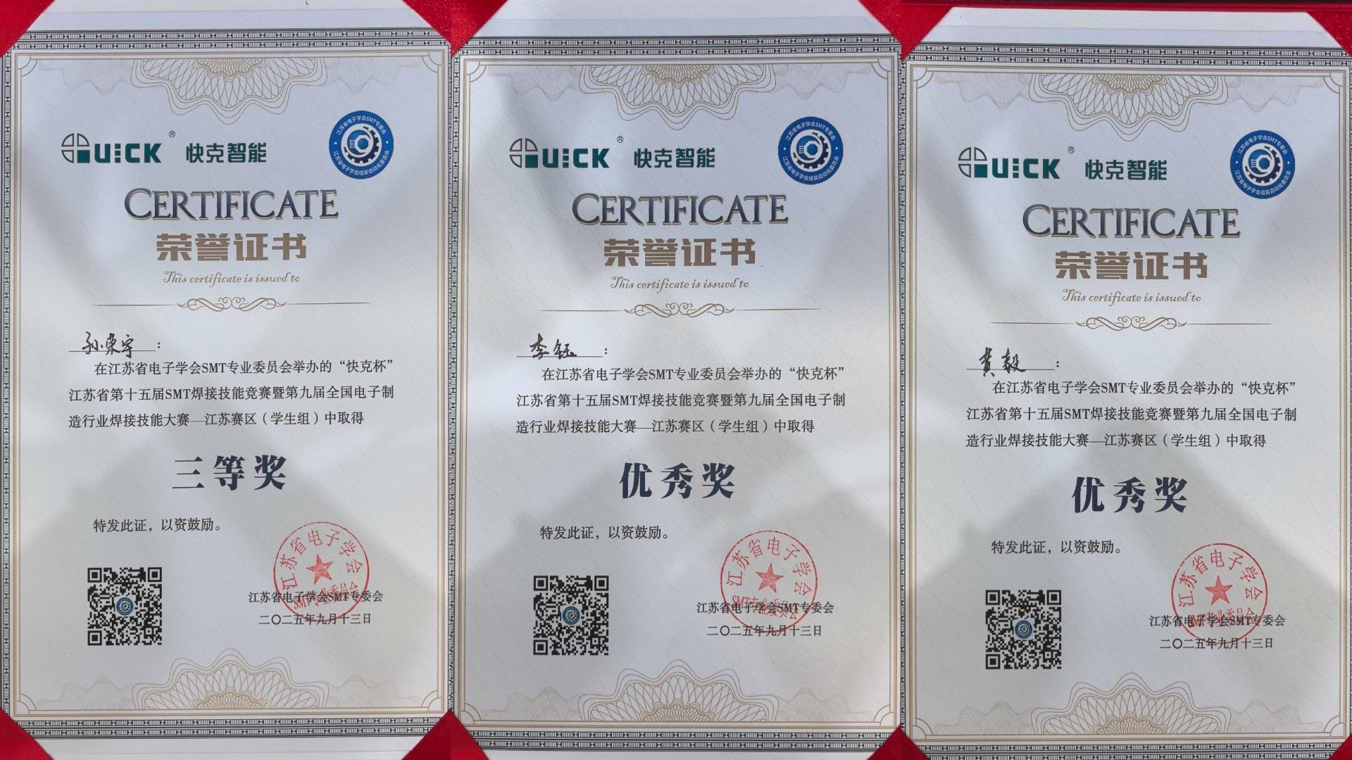 9月13日,“快克杯”江苏省第十五届SMT焊接技能竞赛在苏州成功举办。色情视频 电子与信息技术系孙荣宇、李钰、黄毅三名学生参赛,其中孙荣宇荣获三等奖,李钰、黄毅获优秀奖。
