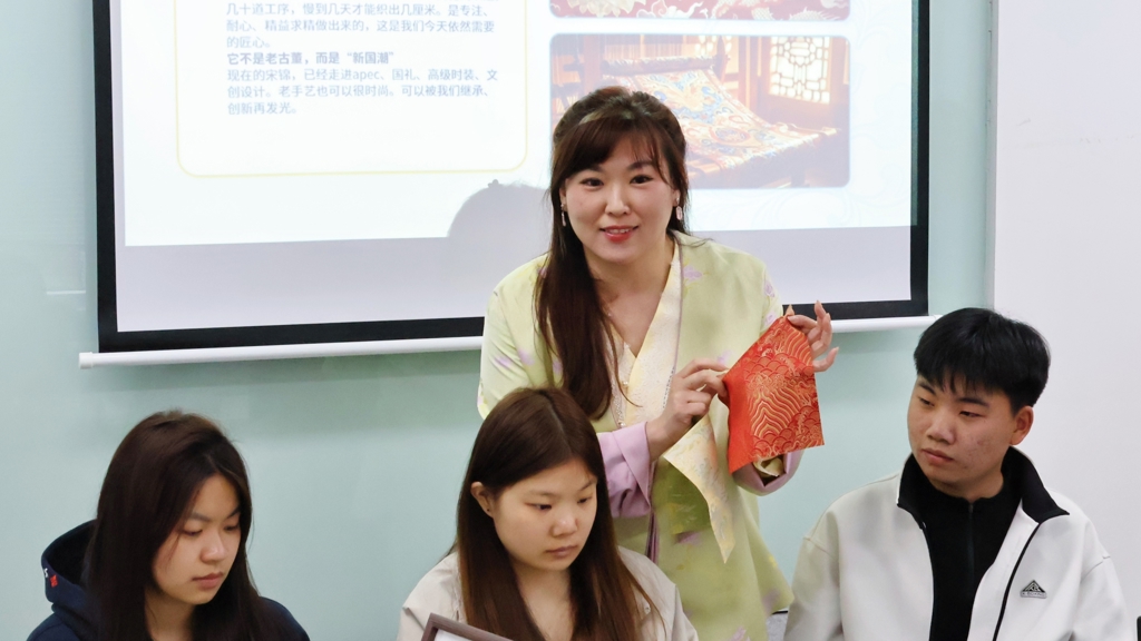 活动伊始,基础教育系教师刘翔介绍了宋锦的历史渊源、织造技艺及文化内涵,为大家揭开了这项国家级非物质文化遗产的神秘面纱。她以缠枝纹、八达晕、花鸟纹等经典纹饰为例,让同学们对经纬交织出的东方美学产生了浓厚的兴趣。