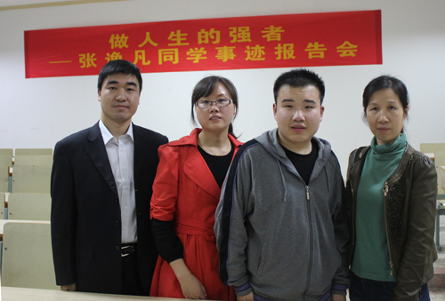 张逸凡同学是该系2013级学生,由于出生时缺氧,导致平衡力差,不能独立行走。但他从不把自己看成残疾人,始终用惊人的毅力克服困难,他常说:“逆境是人生的一面筛子,它挑选出强者,留下弱者。”为了能够独立行走,他从幼儿开始就坚持进行艰苦的康复训练,现在已经能够慢慢地独立站立和行走;为了能够准时上课,他每天至少提前20分钟出发,入学以来从未请过一天假,没有迟到早退过一次。由于身体的原因,张逸凡写字速度极慢,但凭着对知识的强烈渴求,把别人用来玩乐的时间都用在学习上,坚持不懈。为了跟上老师上课的节奏,除了上课认真听讲外,每天还坚持做好预习和复习工作,一丝不苟,踏踏实实。入学以来,他学习成绩优秀,平均成绩92.54分,专业综合排名在全年级第一,在2014-2015学年评优评奖中荣获“一等奖学金”和“专业技能奖学金”,并被评为“三好学生”。