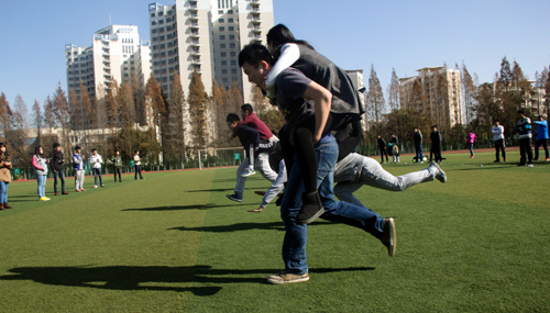 比赛的第一个项目是“美女与野兽”,由四名男生背着女生以接力竞速的方式进行比赛。此外另有“夹气球”、 “校园清洁工”、“前进的小方巾”、“撕铭牌”等各种精彩的比赛项目,呐喊声、欢笑声此起彼伏,赛场气氛非常活跃,最终,艺建系的第一小分队以绝对的优势取得了本届活动的冠军!