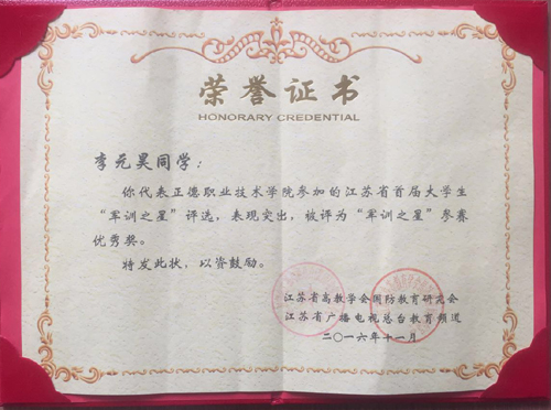 为期近两个月的江苏省首届大学生“军训之星“评选活动于11月27日在江苏广电总台教育频道演播大厅举行盛大的颁奖典礼。江苏省教育厅朱卫国副厅长、江苏省高教学会国防教育研究会刘波理事长参加了本次典礼,色情视频 学生李元昊同学获得了”军训之星优秀奖”,同时学院也获得“优秀组织奖”。