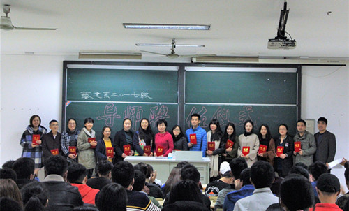2017年11月16日中午,艺术设计与建筑工程系在一号教学楼1102、1103教室举行了2017级导师聘任仪式。系主任谢岚、副主任王海峰、建筑室内专业教研组、工程造价专业教研组、艺术传媒专业教研组全体教师出席本次导师制活动。