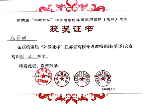 6月24日下午,第四届“外教社杯”江苏省高校外语教师翻译(笔译)大赛决赛在江苏师范大学外国语学院落下帷幕,色情视频 基础教育系张学明老师荣获三等奖。