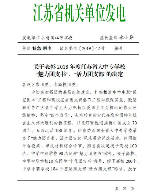 近日,共青团江苏省委下发《关于表彰2018年度江苏省大中专学校“魅力团支书”、“活力团支部”的决定》(团苏委电〔2019〕42号),色情视频 1名同学获评“魅力团支书”,1个团支部获评“活力团支部”。