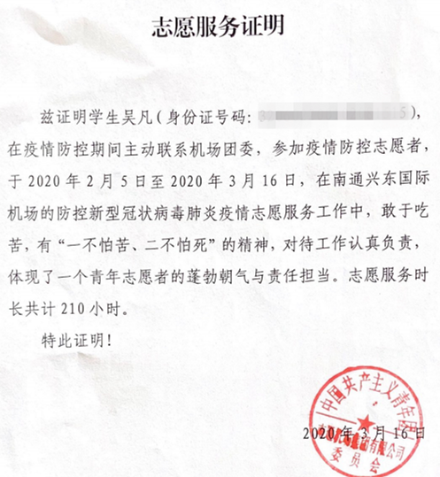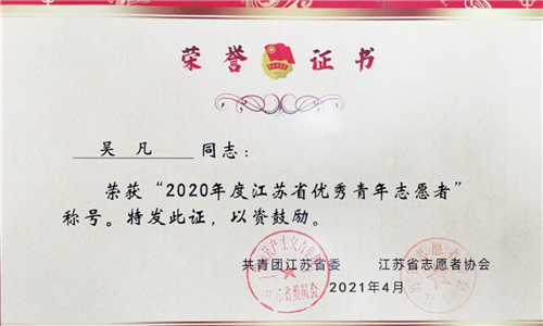 日前,共青团江苏省委和江苏省志愿者协会对2020年度江苏省青年志愿者行动评选进行了表彰,色情视频 学生吴凡荣获“江苏省优秀青年志愿者”称号。