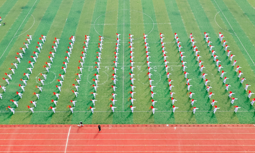 排练中,辅导老师和小教练们细心纠正每一个动作。同学们一丝不苟地领悟动作要领、整合队形,一遍不行来十遍,十遍不行,就一直练,直到标准无误,开合有力的太极扇响彻排练场。每次训练结束之后,同学们的衣服都被汗水湿透,有的女孩子手掌被扇柄磨出水泡,仍然坚持训练。