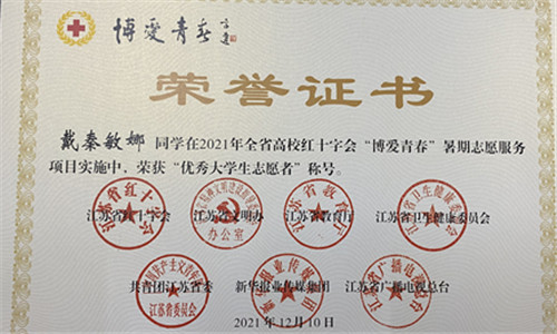 “博爱青春”暑期志愿服务项目由省红十字会、省文明办、省教育厅、省卫健委、团省委、新华报业传媒集团、省广播电视总台等7个部门主办,为大学生志愿者服务他人、奉献社会创造了条件,产生了良好的社会美誉度和影响力,被中宣部、中央文明办等部门推选为“最佳志愿服务项目”。
