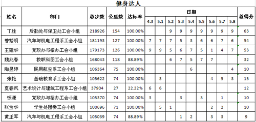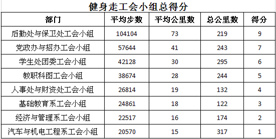 本次活动持续9天,首次采用云上运动方式开展,每日统计个人运动步数,最终丁胜等10名教工胜出,荣获“健身达人”称号,张智灏获评“线路设计创意奖”,其运动期间在校园内走出的“正德厚生”轨迹图,解锁走步新姿势,带给大家耳目一新的感受,在强身健体的同时也展示出我们全院教职工健康阳光、朝气蓬勃的精神面貌。工会小组按平均步数排名,后勤处与保卫处工会小组、党政办与招办工会小组、学生处团委工会小组获得前三名。
