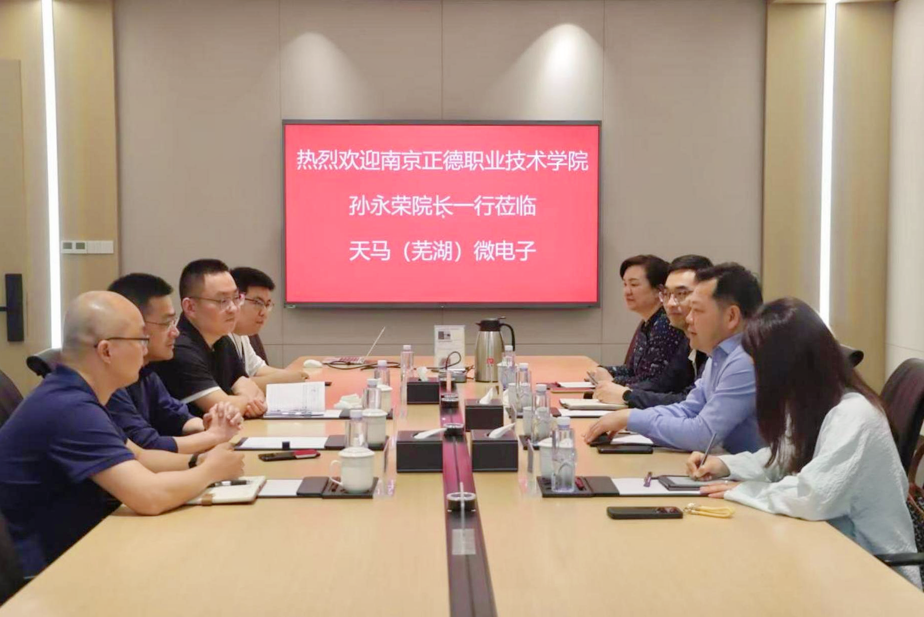 校企双方就人才培养模式、实习就业等方面进行了深入探讨,并达成了合作意向。随后,在李虎等的陪同下,孙永荣一行参观了天马(芜湖)的自动化生产线、生活区、住宿区等。
